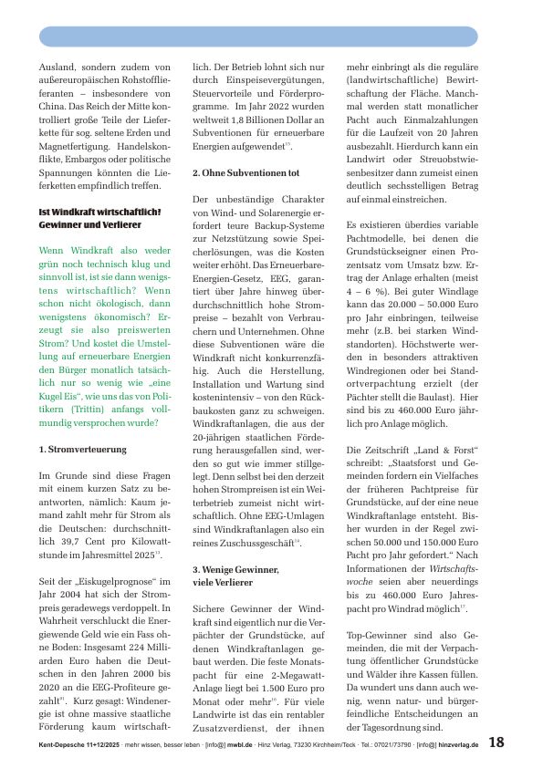 »Seit Jahren explodiert die Zahl der Windkraftanlagen (WKA) in Deutschland regelrecht: Windräder auf Bergrücken, Feldern, ja vermehrt auch in Wäldern und sogar in Schutzgebieten – sowie an unseren Küsten und im Meer. Schon heute ist unsere Heimat das Land mit der höchsten WKA-Dichte weltweit. Windenergie wird in der öffentlichen Debatte als die saubere, grüne Lösung zur Rettung des Klimas gefeiert. Politiker, Lobbygruppen und die großen Medien verkaufen sie den Bürgern als Nonplusultra für eine nachhaltige Zukunft, als „alternativlos“ im Kampf gegen den „Klimawandel“. Doch hinter dem glatt polierten Image verbirgt sich eine Reihe tiefgreifender Probleme, die selten offen angesprochen werden – eine unbequeme Realität, die kaum einmal den Weg in die Massenmedien findet. Dieser Artikel legt die ökologischen, technischen, wirtschaftlichen, gesellschaftlichen und gesundheitlichen Schattenseiten der Windkraft ungeschönt und faktenbasiert offen – jenseits aller Ideologien, aller Werbekampagnen und aller Geschäftsinteressen.«