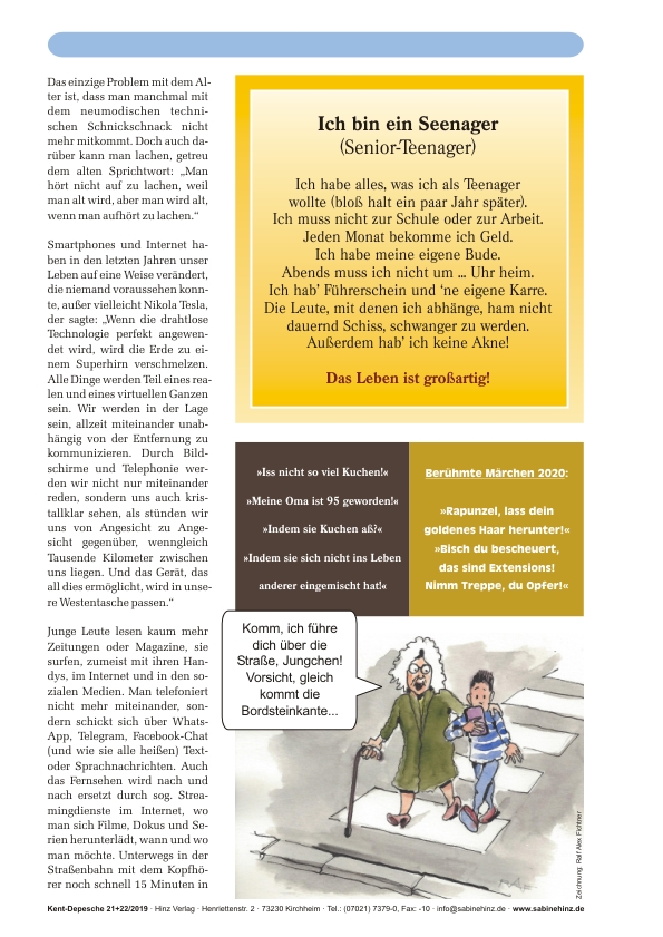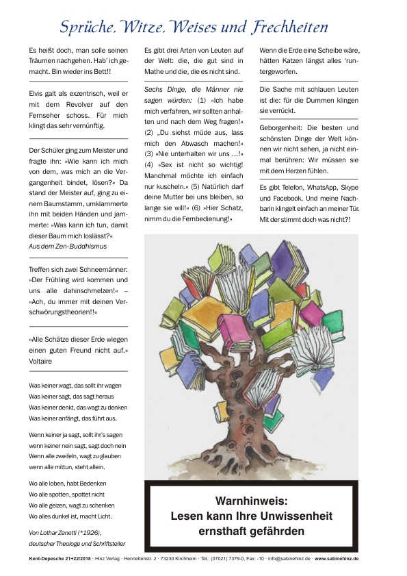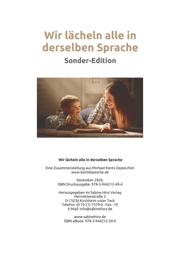Mit über 1.000 (!) Sprüchen, Zitaten, Witzen, Cartoons, Spruchbildern, besinnlichen Kurzgeschichten, klugen Lebensweisheiten, rührenden Gleichnissen und Fabeln, lustigen Kindersprüchen u.v.a. Enthält alle Depeschen „Wir lächeln alle in derselben Sprache“ aus den Jahren 2016, 2017, 2018, 2019 und 2020 (jeweils ohne Titelbilder und ohne Formulare), 120 reine Inhaltsseiten DIN A4, komplett in Farbe gedruckt – über 100 handgezeichnete Cartoons von Ralf Alex Fichtner, Frans Stummer und „Nikto“, weit über 200 Fotos und 25 großen Grafiken. Die Depeschen der früheren Jahre wurden dabei umfassend überarbeitet, verbessert und aktualisiert.